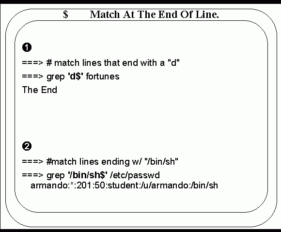 In the first example, we’re matching any line that ends with the d character just prior to the newline. Based upon the contents of the fortune file, line 36 satisfies that match from the fortunes file.
