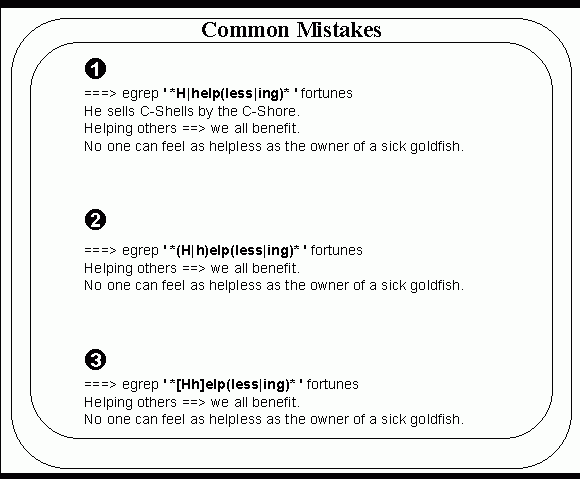In example One, we’re trying to match the words: Help, help, helpless, Helpless, helping, or Helping. Notice the mistake made in the regular expression specified. The expression for the first example is: