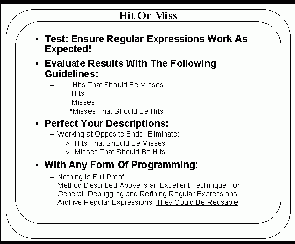 Just like any form of programming, nothing is full proof! The method described here is an excellent technique for debugging and refining regular expressions. Don’t forget to archive your regular expressions (especially the complex/tedious ones); regardless of the frequency that the expression is used. You never know if you will need it again or have an equivalent pattern match.