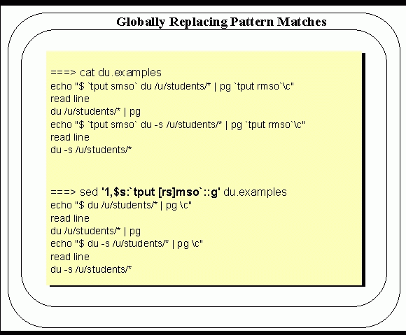 In the replacement string includes nothing to replace. Thus tput smso or tput rmso are being removed wherever they exist. Notice the g character at the end of the last character. This is necessary to perform the required global substitution. Otherwise, the first occurrence will be substituted for only.