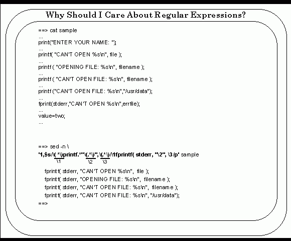 This example is an interesting one showing a decent dilemma when massive code changes are in order. In this example the scenario is as follows: change all printf() function calls to fprint() function calls while preserving the message to be printed.
